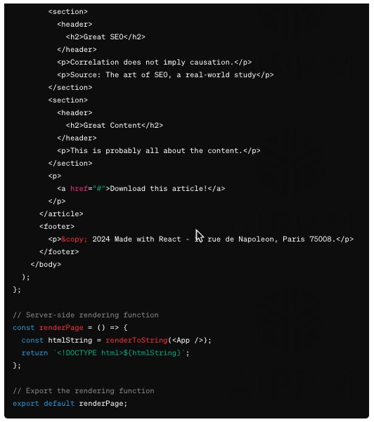 - Enfin, la fonction ‘renderPage’ est exportée pour être utilisée dans le code côté serveur. Elle permet de transformer le composant React en HTML.